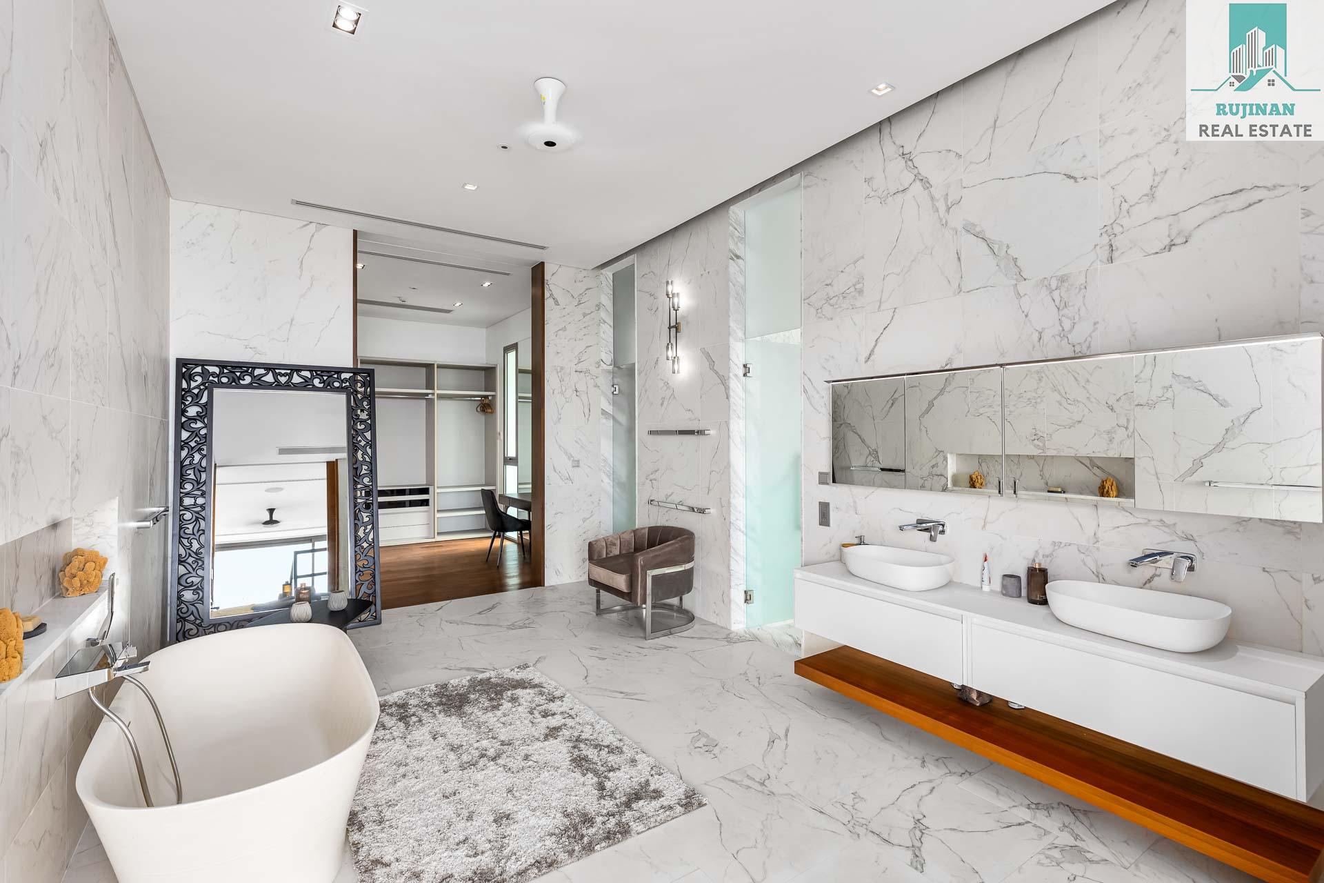 The penthouse spans over 735 square meters of meticulously designed and maintained interior space, featuring four palatial bedrooms, each with its own en-suite bathroom. The master suite is a sanctuary of indulgence, complete with a private terrace overlooking the azure waters, a spa-like bathroom adorned in Italian marble, and a walk-in closet fit for a fashion connoisseur.