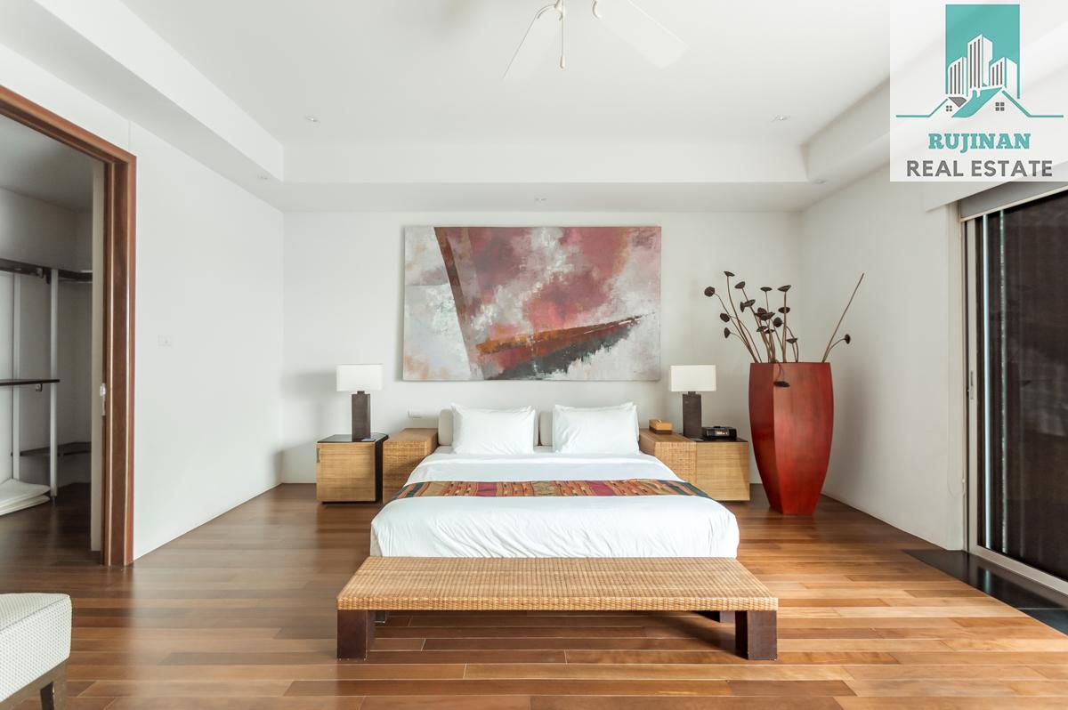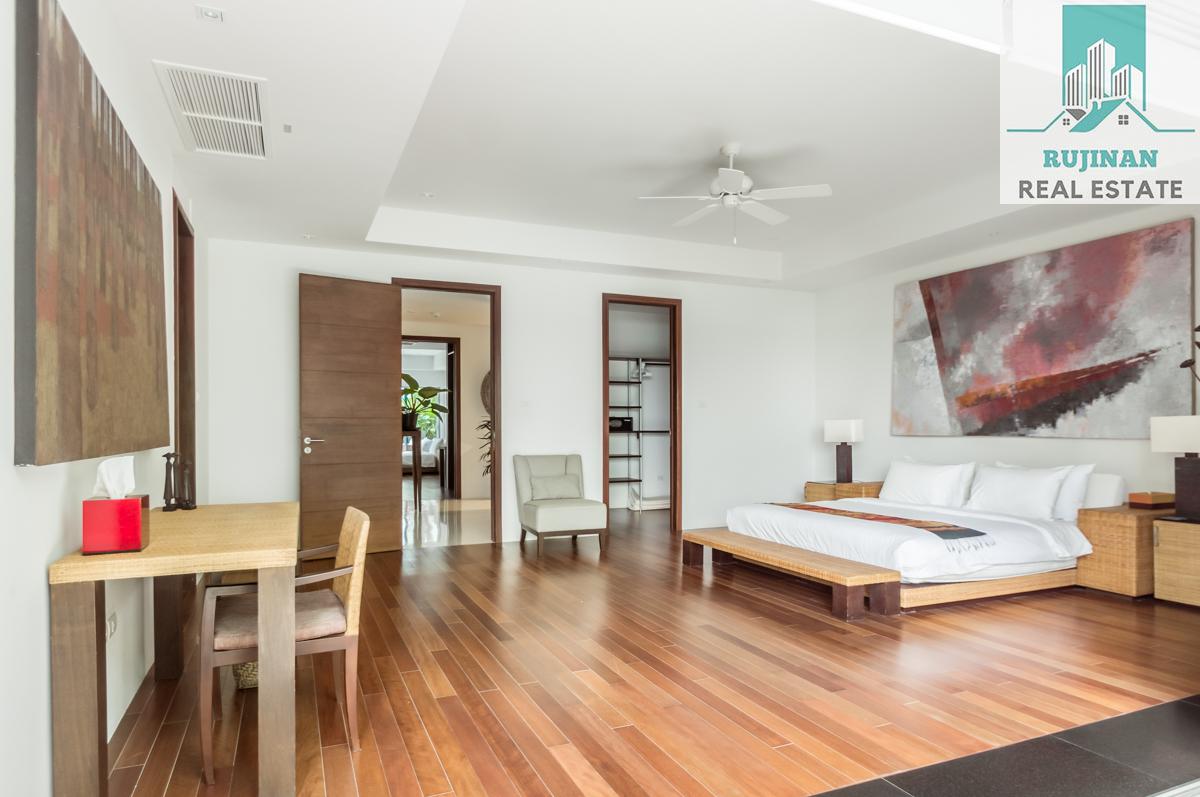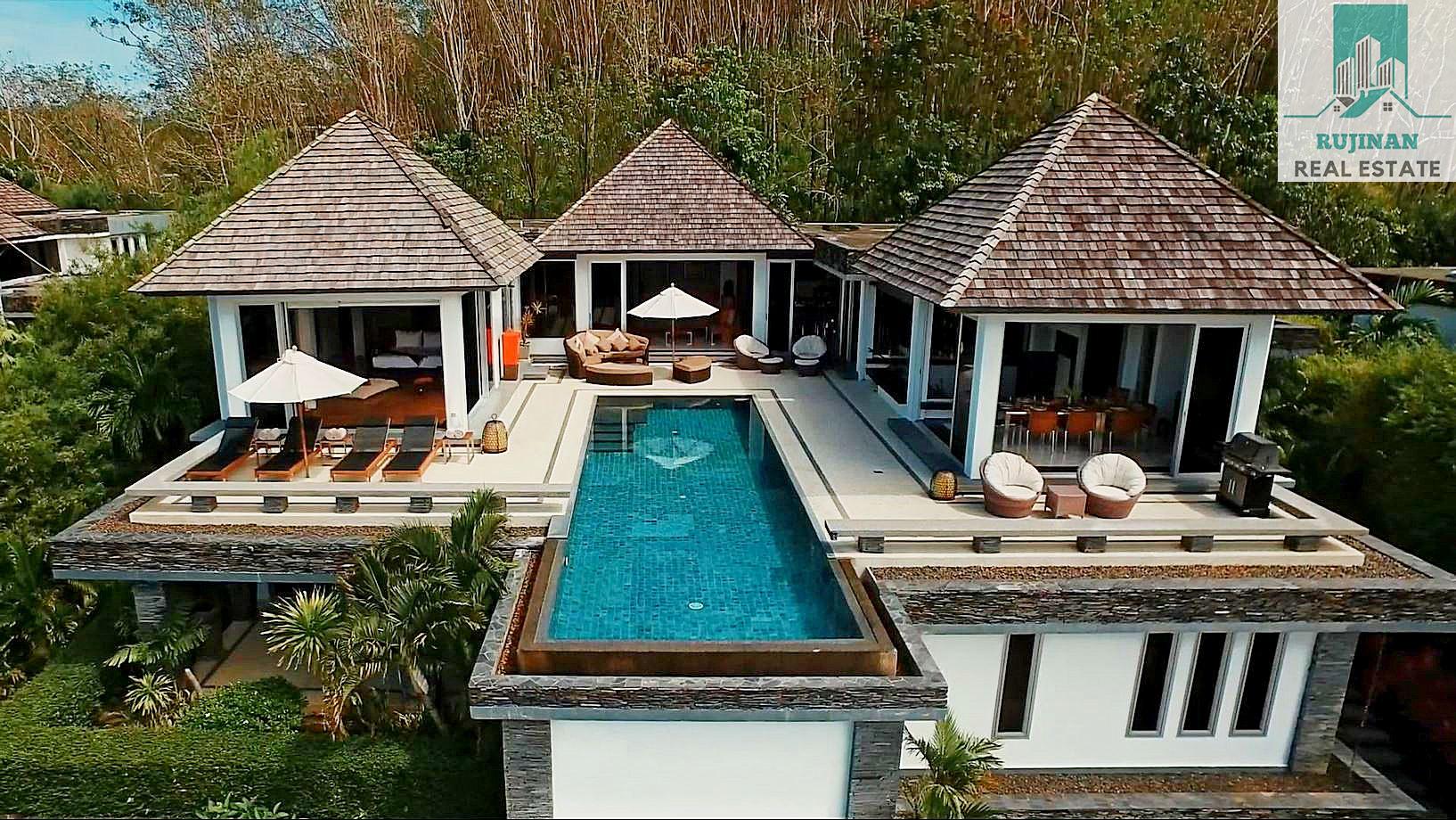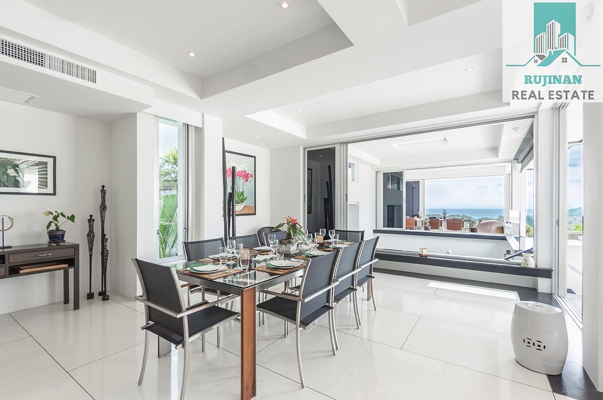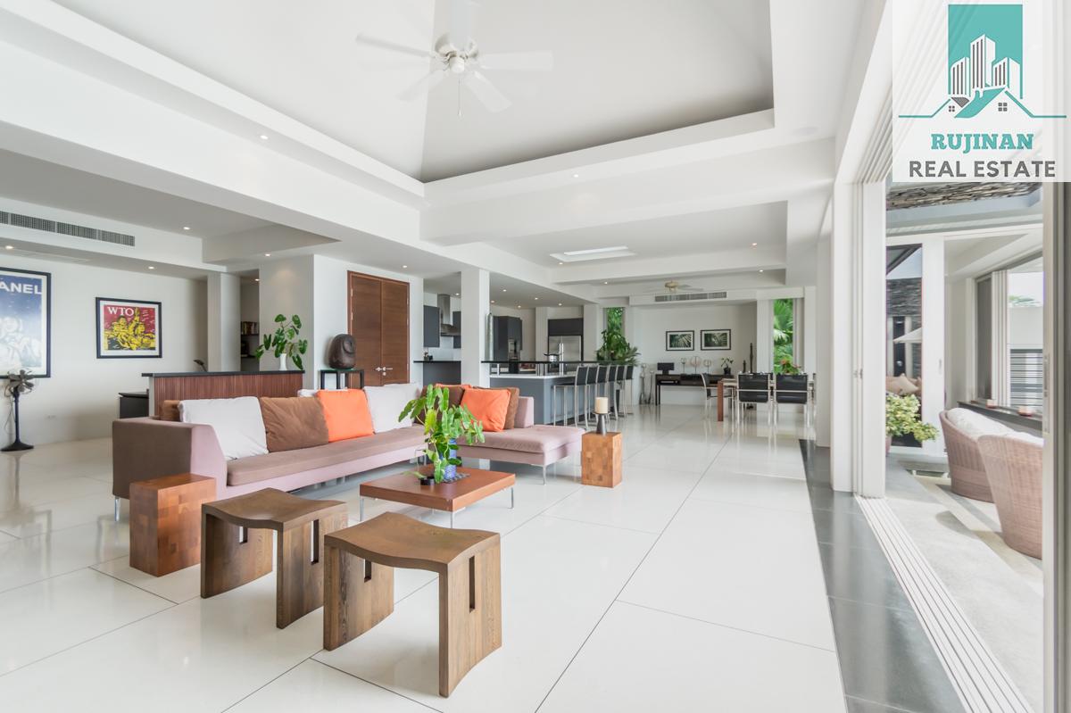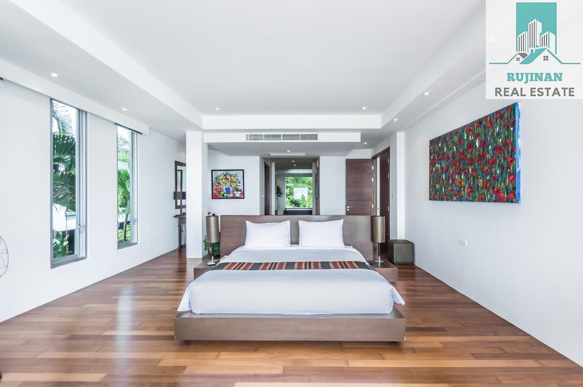 An impressive sea view pool villa, in a tranquil location overlooking Layan Beach and the whole of Bang Tao Bay with a beautiful sunset sea view. Masses of space and 5 large ensuite double bedrooms over two levels designed in a contemporary Asian architectural style.